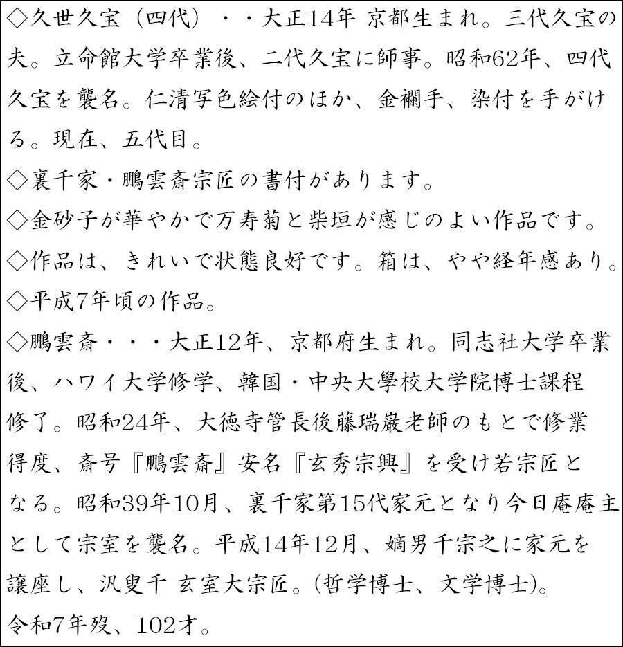 ◇鵬雲斎・・・大正12年、京都府生まれ。同志社大学卒業後、ハワイ大学修学、韓国・中央大學校大学院博士課程修了。昭和24年、大徳寺管長後藤瑞巌老師のもとで修業得度、斎号『鵬雲斎』安名『玄秀宗興』を受け若宗匠となる。昭和39年10月、裏千家第15代家元となり今日庵庵主として宗室を襲名。平成14年12月、嫡男千宗之に家元を譲座し、汎叟千 玄室大宗匠。(哲学博士、文学博士)。令和7年歿、102才。