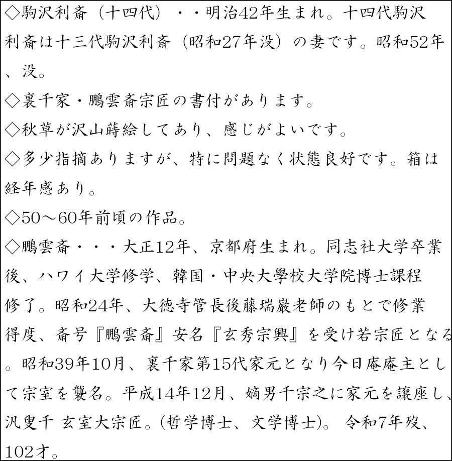 ◇鵬雲斎・・・大正12年、京都府生まれ。同志社大学卒業後、ハワイ大学修学、韓国・中央大學校大学院博士課程修了。昭和24年、大徳寺管長後藤瑞巌老師のもとで修業得度、斎号『鵬雲斎』安名『玄秀宗興』を受け若宗匠となる。昭和39年10月、裏千家第15代家元となり今日庵庵主として宗室を襲名。平成14年12月、嫡男千宗之に家元を譲座し、汎叟千 玄室大宗匠。(哲学博士、文学博士)。 令和7年歿、102才。