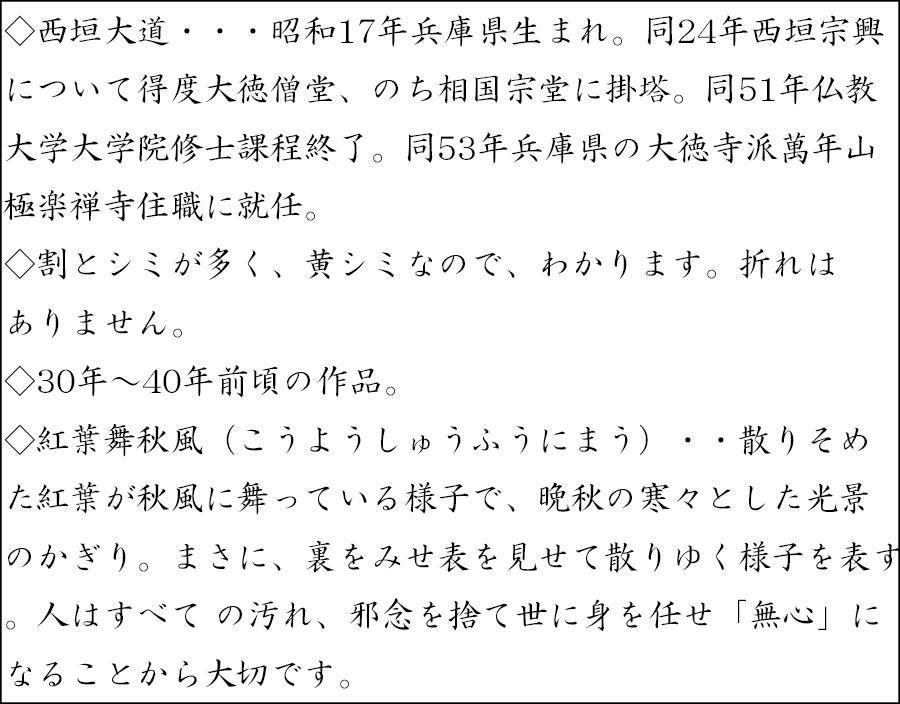 ◇紅葉舞秋風(こうようしゅうふうにまう)・・散りそめた紅葉が秋風に舞っている様子で、晩秋の寒々とした光景のかぎり。まさに、裏をみせ表を見せて散りゆく様子を表す。人はすべて の汚れ、邪念を捨て世に身を任せ「無心」になることから大切です。