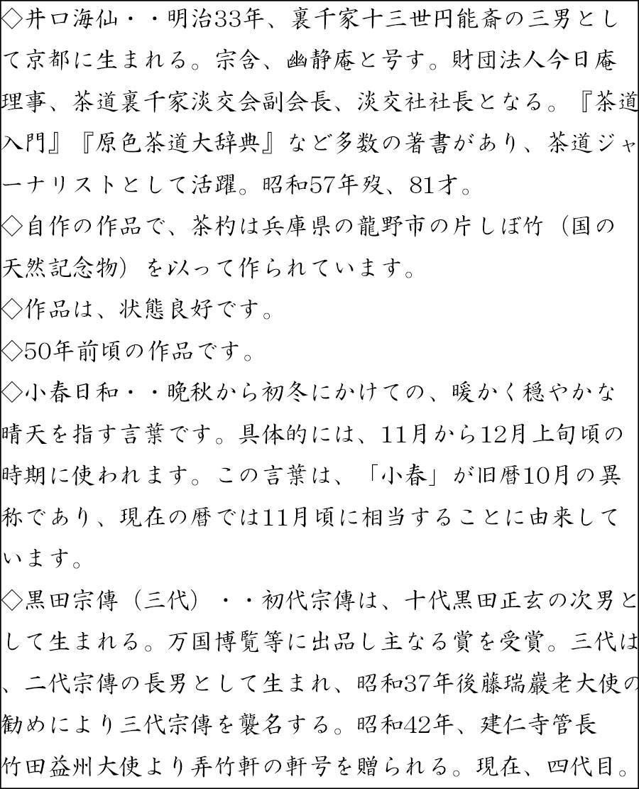 ◇井口海仙・・明治33年、裏千家十三世円能斎の三男として京都に生まれる。宗含、幽静庵と号す。財団法人今日庵理事、茶道裏千家淡交会副会長、淡交社社長となる。『茶道入門』『原色茶道大辞典』など多数の著書があり、茶道ジャーナリストとして活躍。昭和57年歿、81才。