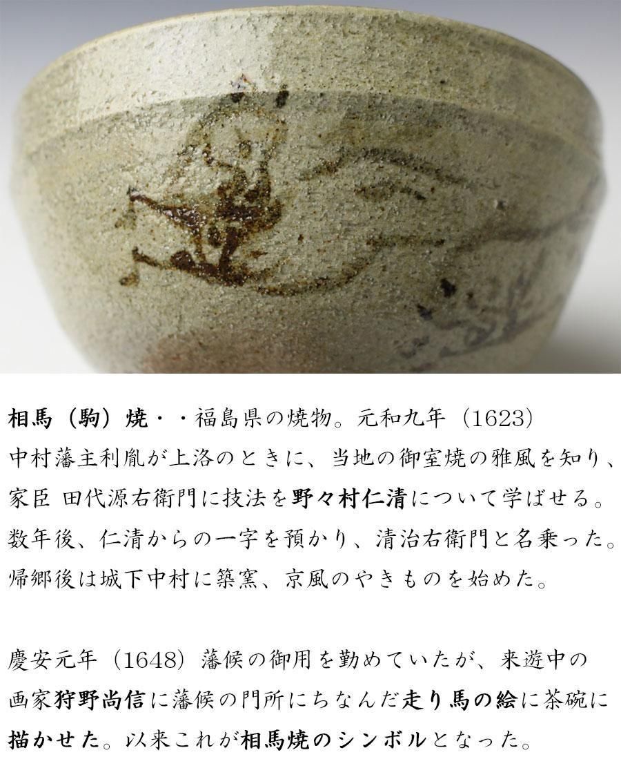 ◇相馬(駒)焼・・福島県の焼物。元和九年(1623)中村藩主利胤が上洛のときに、当地の御室焼の雅風を知り、家臣田代源右衛門に技法を野々村仁清について学ばせる。数年後、仁清からの一字を預かり、清治右衛門と名乗った。帰郷後は城下中村に築窯、京風のやきものを始めた。慶安元年(1648)藩候の御用を勤めていたが、来遊中の画家狩野尚信に藩候の門所にちなんだ走り馬の絵に茶碗に描かせた。以来これが相馬焼のシンボルとなった。
