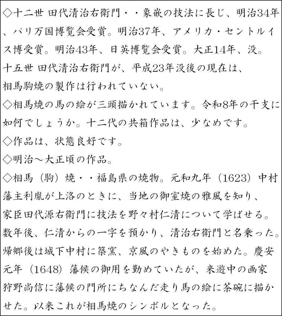 ◇十二世 田代清治右衛門・・象嵌の技法に長じ、明治34年、パリ万国博覧会受賞。明治37年、アメリカ・セントルイス博受賞。明治43年、日英博覧会受賞。大正14年、没。十五世 田代清治右衛門が、平成23年没後の現在は、相馬駒焼の製作は行われていない。